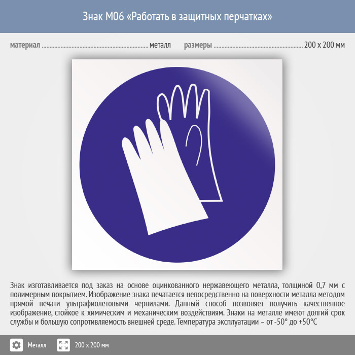 Знак M06 «Работать в защитных перчатках» (металл, 200х200 мм) в Нижнекамске купить