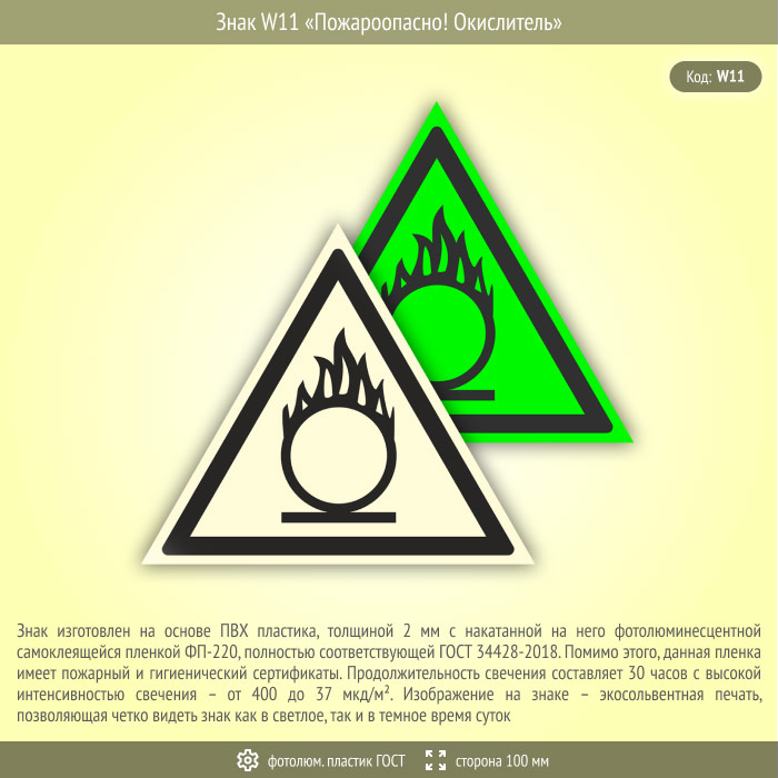 Знак W11 «Пожароопасно! Окислитель» (фотолюминесцентный пластик ГОСТ 34428-2018, сторона 100 мм) в Нижнекамске купить