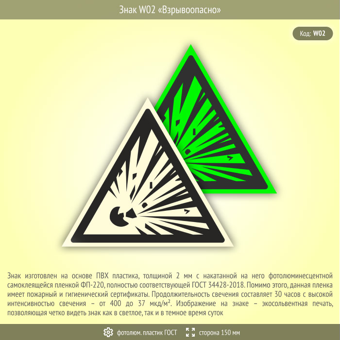 Знак W02 «Взрывоопасно» (фотолюминесцентный пластик ГОСТ 34428-2018, сторона 150 мм) в Нижнекамске купить