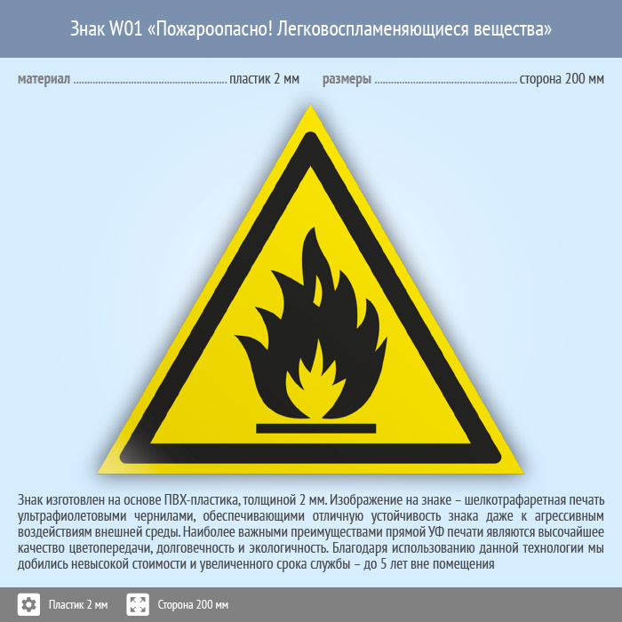 Знак W01 «Пожароопасно! легковоспламеняющиеся вещества» (пластик, сторона 200 мм) в Нижнекамске купить