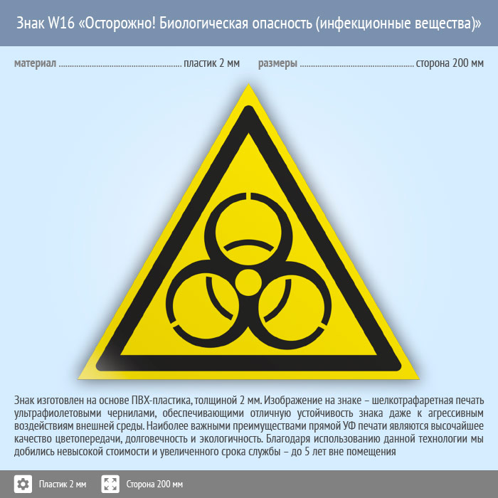 Знак W16 «Осторожно! биологическая опасность (инфекционные вещества)» (пластик, сторона 200 мм) в Нижнекамске купить