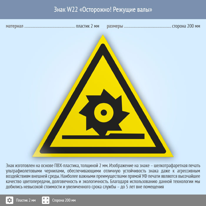 Знак W22 «Осторожно! режущие валы» (пластик, сторона 200 мм) в Нижнекамске купить