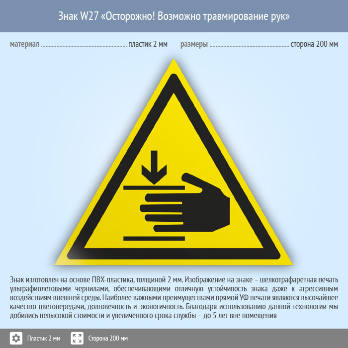 Знак W27 «Осторожно! возможно травмирование рук» (пластик, сторона 200 мм) в Нижнекамске купить