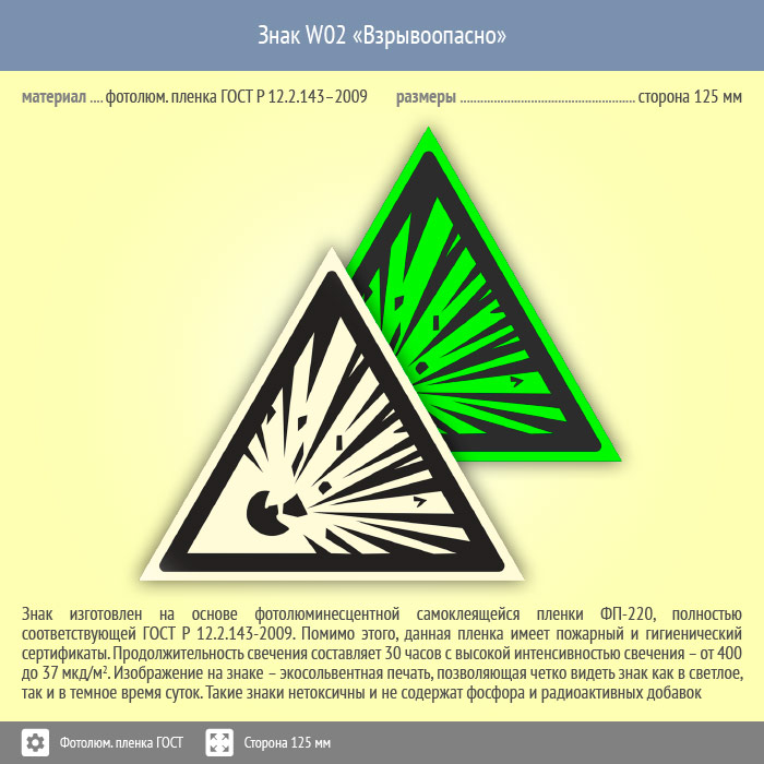 Знак W02 «Взрывоопасно» (фотолюминесцентная пленка ГОСТ 34428-2018, сторона 125 мм) в Нижнекамске купить