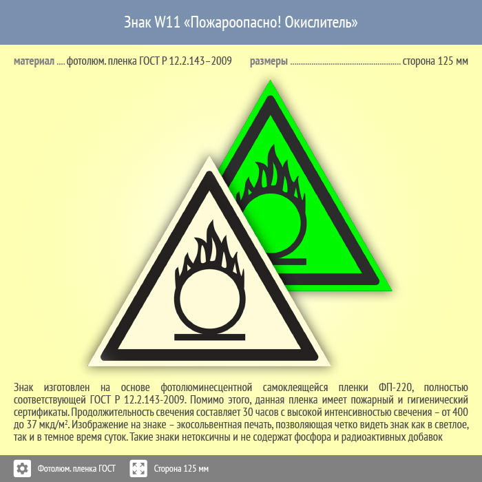 Знак W11 «Пожароопасно! окислитель» (фотолюминесцентная пленка ГОСТ 34428-2018, сторона 125 мм) в Нижнекамске купить