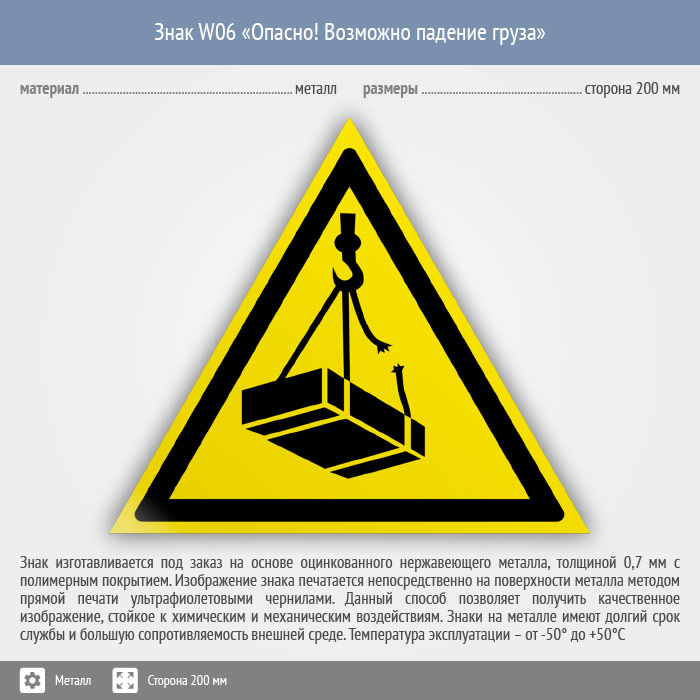 Знак W06 «Опасно! возможно падение груза» (металл, сторона 200 мм) в Нижнекамске купить