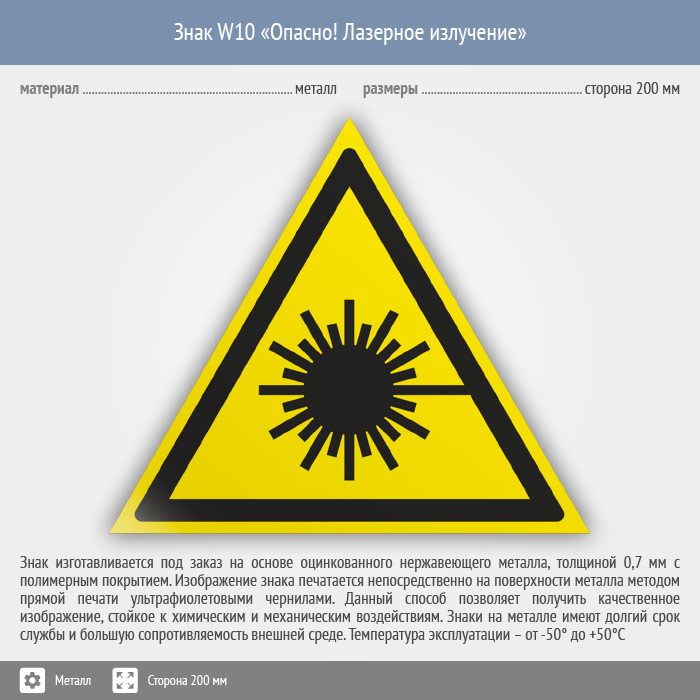Знак W10 «Опасно! лазерное излучение» (металл, сторона 200 мм) в Нижнекамске купить