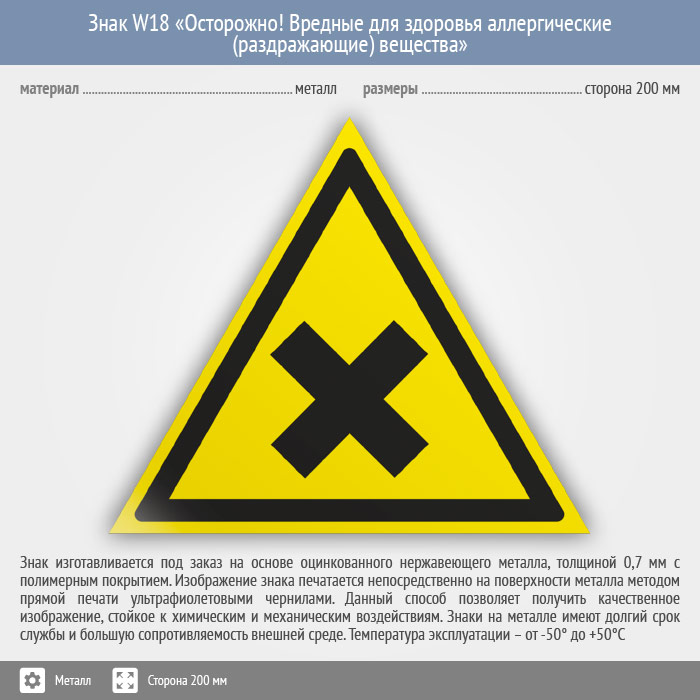 Знак W18 «Осторожно! вредные для здоровья аллергические (раздражающие) вещества» (металл, сторона 200 мм) в Нижнекамске купить