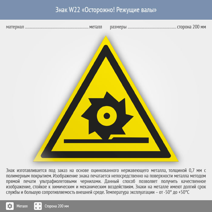 Знак W22 «Осторожно! режущие валы» (металл, сторона 200 мм) в Нижнекамске купить