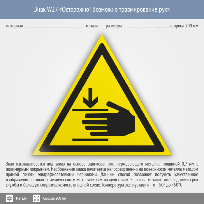 Знак W27 «Осторожно! возможно травмирование рук» (металл, сторона 200 мм) в Нижнекамске купить