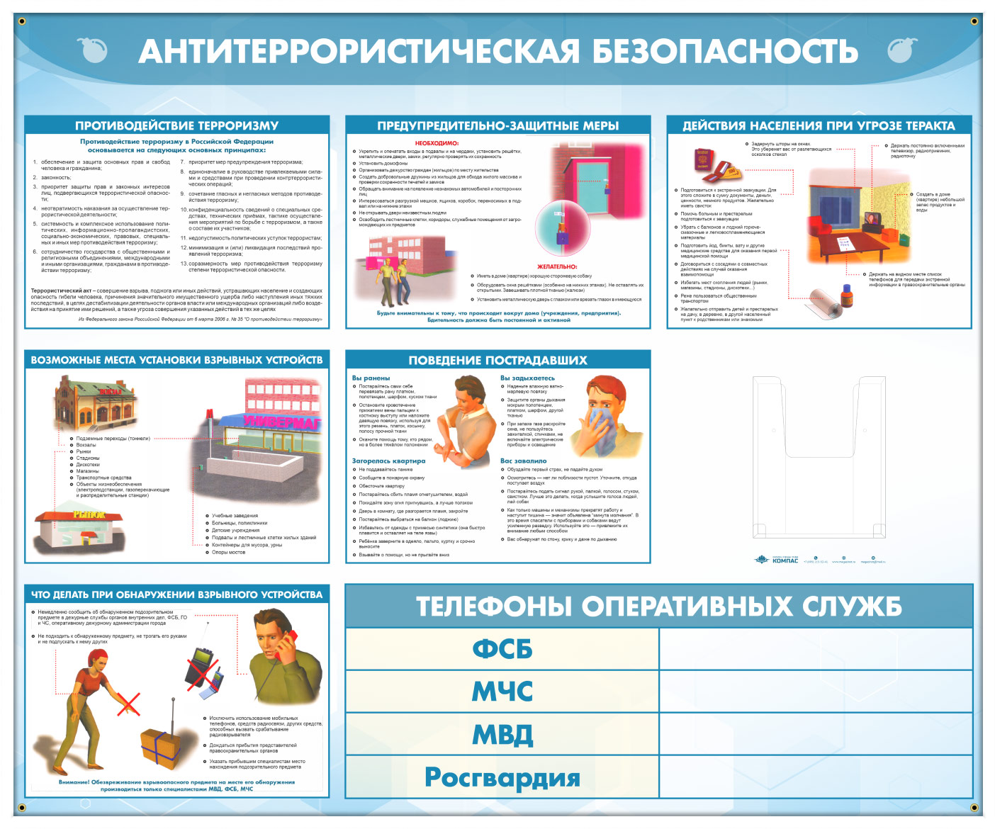 Стенд «Антитеррористическая безопасность» с глубоким А5 карманом - это важнейшая информация о необходимых действиях по выявлению готовящегося теракта и о том, как себя вести в случае террористического акта