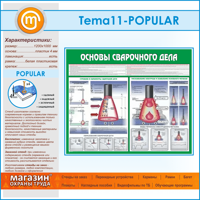 Стенд «Основы сварочного дела» – это полезная информация сварщикам: строение и параметры сварочной дуги, расплавление электрода и плавление основного металла…