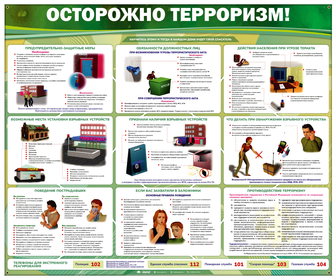 Стенд «Осторожно терроризм!» научит Вас, что делать при обнаружении взрывных устройств и подозрительных предметов и как себя вести, если Вы оказались в заложниках. На стенде представлена выдержка из законодательства о мерах по противодействию терроризму и обязанности должностных лиц. Изучив информацию, размещенную на стенде, Вы будете знать, что делать во время теракта и при его угрозе, запомните телефоны для экстренного вызова спецслужб