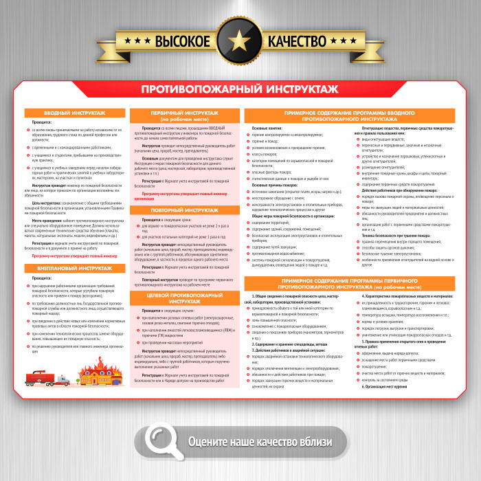 Стенд «Умей действовать при пожаре» содержит самые важные аспекты пожарной безопасности. Чисто теоретических плакатов здесь всего 2 - «Требования законодательства о ПБ» и «Противопожарный инструктаж». Все же остальные - максимально практичные и наглядно объясняют причины пожаров, как их не допустить и что делать, если пожар все же произошел. Также подробно освещена тема оказания первой помощи при ожогах разной степени тяжести. Как всегда, только актуальная информация, качественные иллюстрации и современный дизайн!