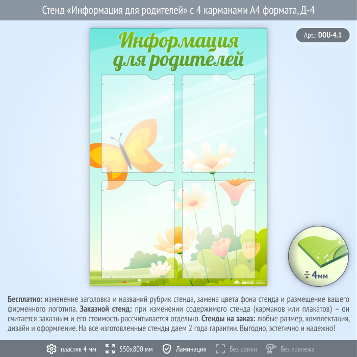 Стенд «Информация для родителей» с 4 карманами А4 формата (DOU-4.1) в Нижнекамске купить