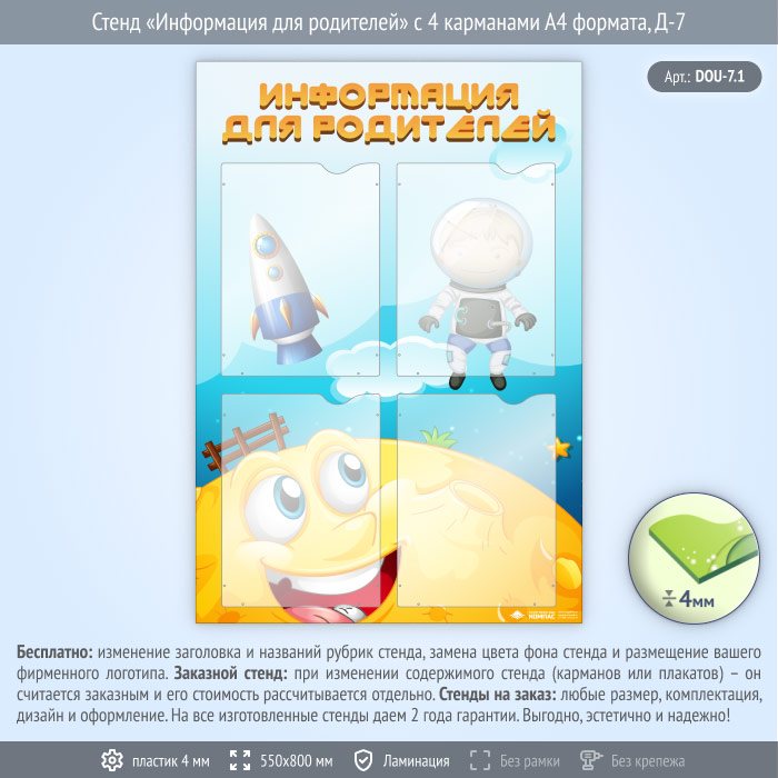 Стенд «Информация для родителей» с 4 карманами А4 формата (DOU-7.1) в Нижнекамске купить
