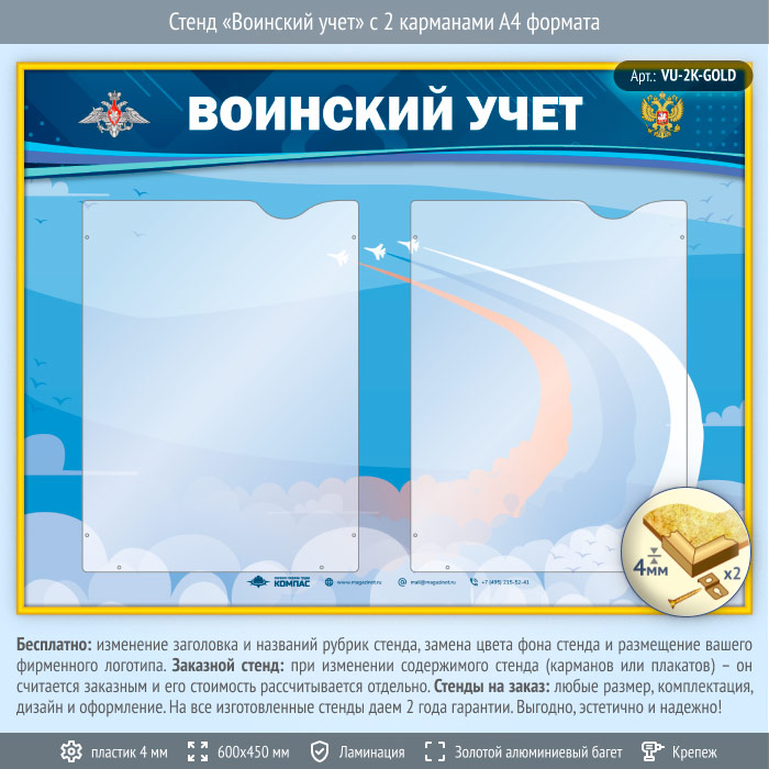Стенд «Воинский учет» с 2 карманами А4 формата (VU-2K-GOLD) в Нижнекамске купить