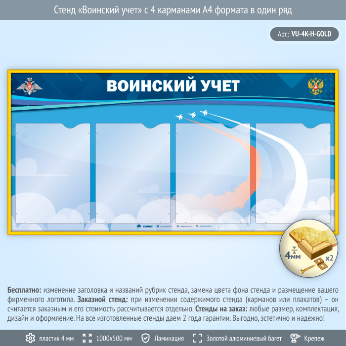 Стенд «Воинский учет» с 4 карманами А4 формата в один ряд (VU-4K-H-GOLD) в Нижнекамске купить