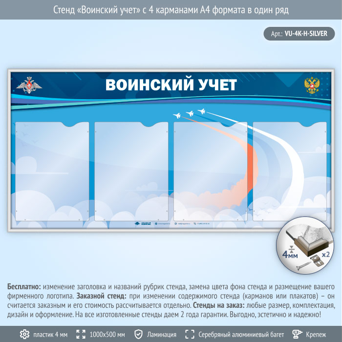 Стенд «Воинский учет» с 4 карманами А4 формата в один ряд (VU-4K-H-SILVER) в Нижнекамске купить