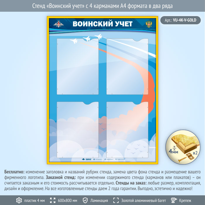 Стенд «Воинский учет» с 4 карманами А4 формата в два ряда (VU-4K-V-GOLD) в Нижнекамске купить
