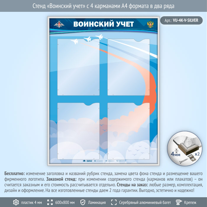 Стенд «Воинский учет» с 4 карманами А4 формата в два ряда (VU-4K-V-SILVER) в Нижнекамске купить