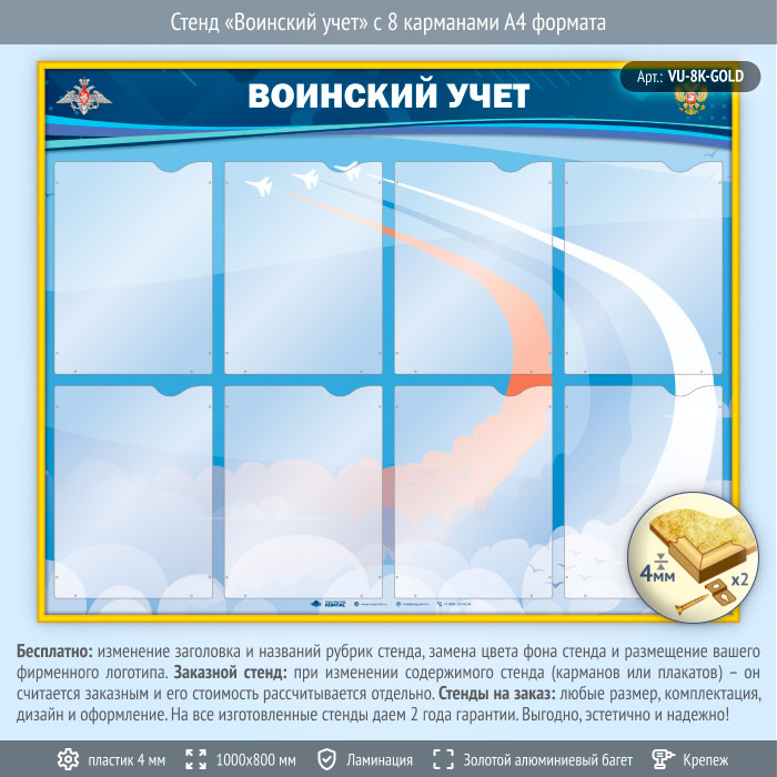Стенд «Воинский учет» с 8 карманами А4 формата (VU-8K-GOLD) в Нижнекамске купить