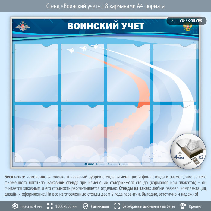 Стенд «Воинский учет» с 8 карманами А4 формата (VU-8K-SILVER) в Нижнекамске купить