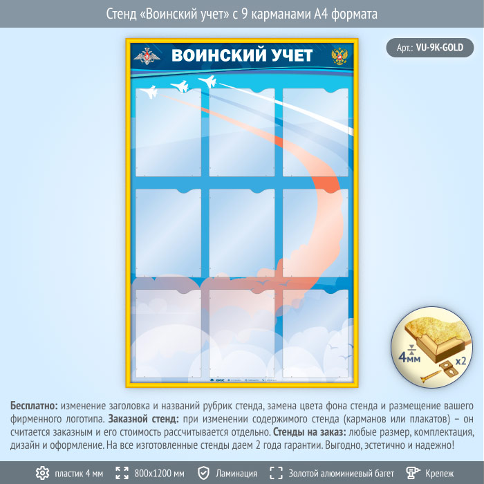 Стенд «Воинский учет» с 9 карманами А4 формата (VU-9K-GOLD) в Нижнекамске купить