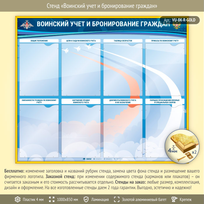 Стенд «Воинский учет и бронирование граждан» с 8 карманами А4 формата (VU-8K-R-GOLD) в Нижнекамске купить