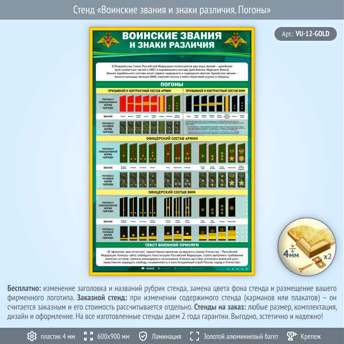 Стенд «Воинские звания и знаки различия. Погоны» (VU-12-GOLD) в Нижнекамске купить