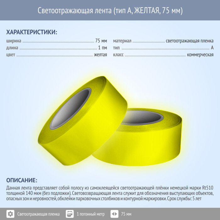 Светоотражающая однородная лента (тип А, ЖЕЛТАЯ, 75 мм х 1 п.м.) в Нижнекамске купить
