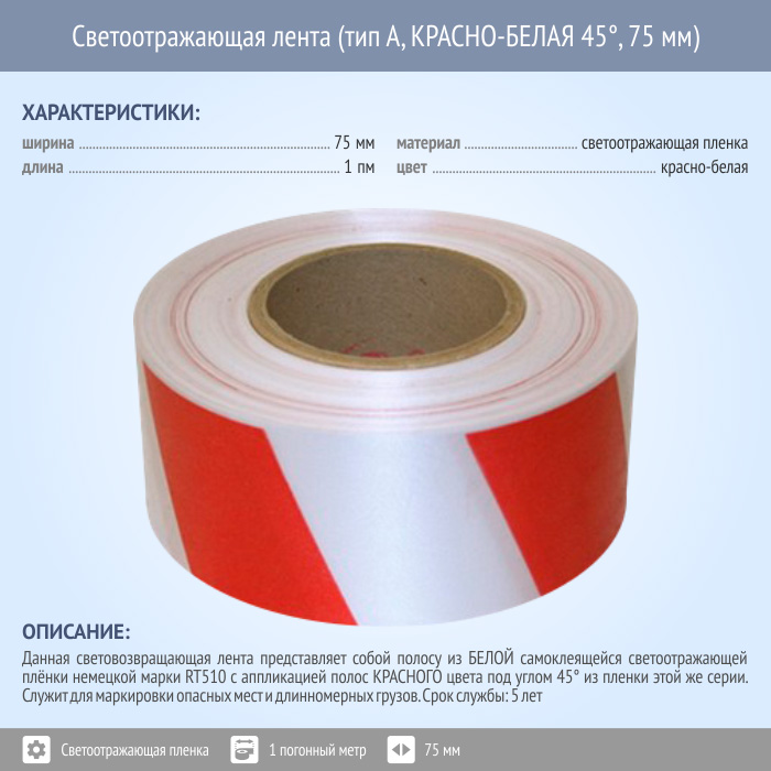 Светоотражающая сигнальная лента (тип А, КРАСНО-БЕЛАЯ 45°, 75 мм х 1 п.м.) в Нижнекамске купить