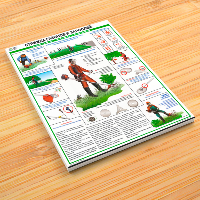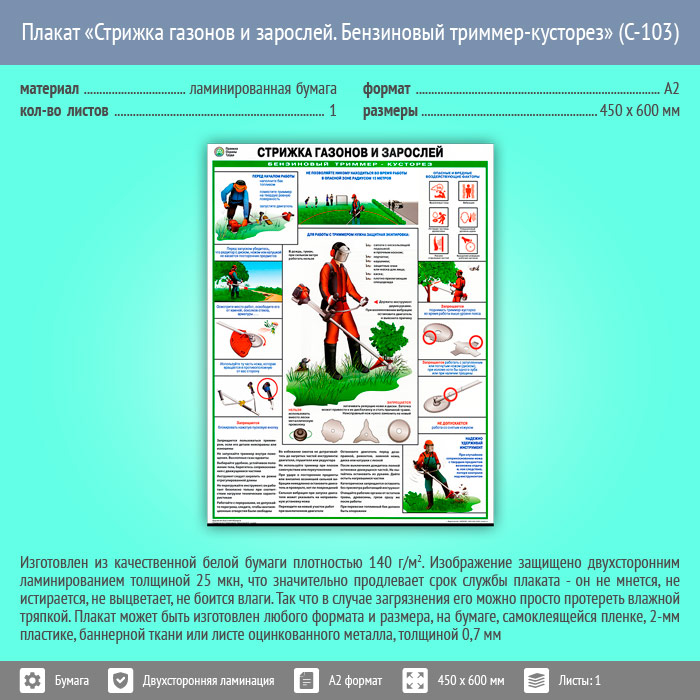 Плакат «Стрижка газонов и зарослей. Бензиновый триммер-кусторез» (С-103, ламинированная бумага, А2, 1 лист) в Нижнекамске купить
