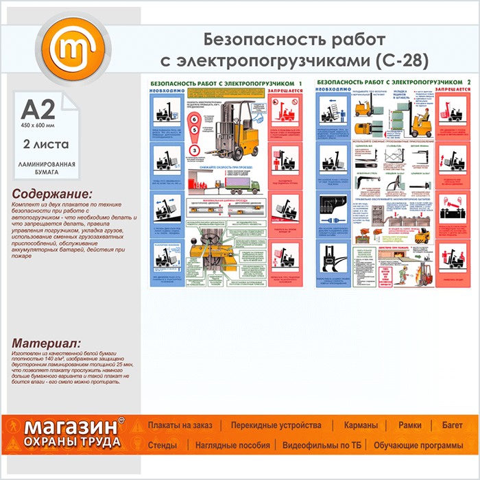 Плакаты «Безопасность работ с электропогрузчиками» (С-28, ламинированная бумага, А2, 2 листа) в Нижнекамске купить