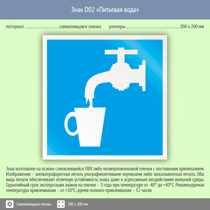 Знак D02 «Питьевая вода» (пленка, 200х200 мм) в Нижнекамске купить