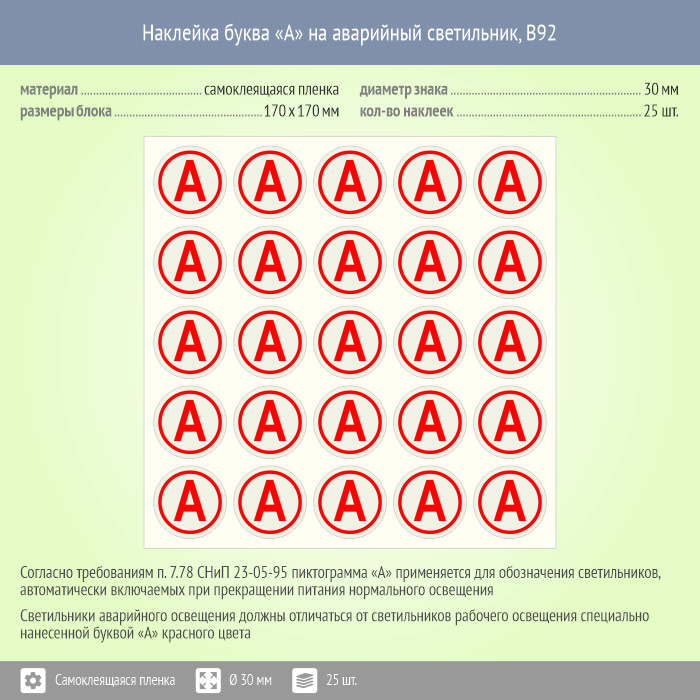 Наклейка буква «А» на аварийный светильник, B92 (пленка, диаметр 30 мм, блок 25 штук, 170х170 мм) в Нижнекамске купить