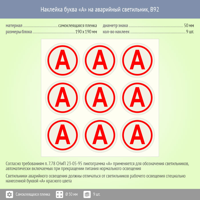Наклейка буква «А» на аварийный светильник, B92 (пленка, диаметр 50 мм, блок 9 штук, 190х190 мм) в Нижнекамске купить