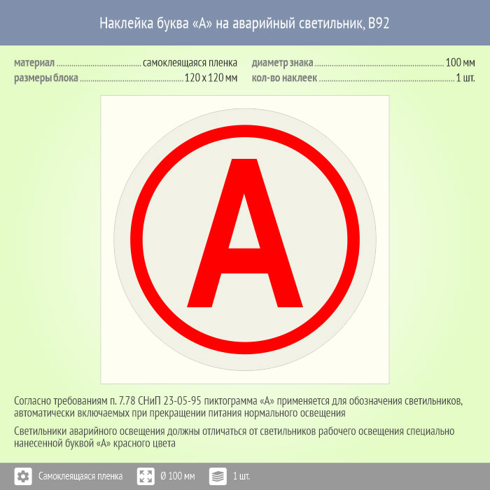 Наклейка буква «А» на аварийный светильник, B92 (пленка, диаметр 100 мм, 120х120 мм) в Нижнекамске купить