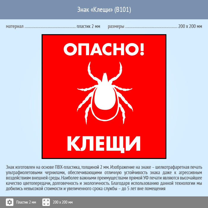 Знак «Опасно! Клещи», B101 (пластик, 200х200 мм) в Нижнекамске купить