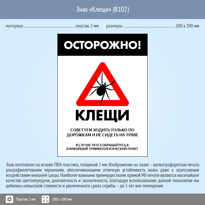 Знак «Осторожно! Клещи», B102 (пластик, 400х600 мм) в Нижнекамске купить