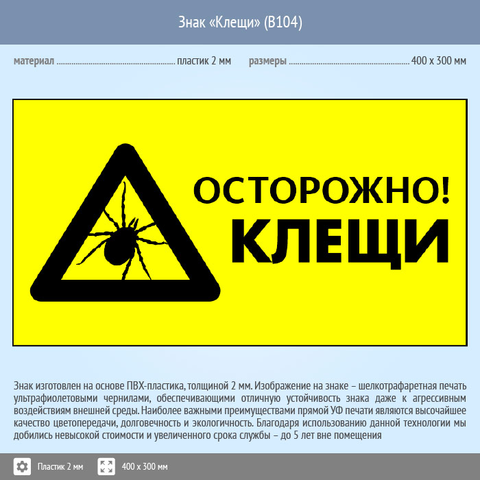 Знак «Осторожно! Клещи», B104 (пластик, 300х200 мм) в Нижнекамске купить