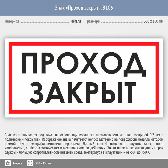 Знак «Проход закрыт», B106 (металл, 300х150 мм) в Нижнекамске купить