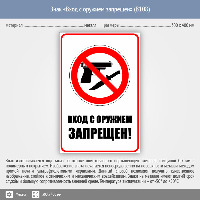 Знак «Вход с оружием запрещен», B108 (металл, 300х400 мм) в Нижнекамске купить