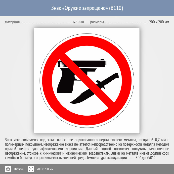 Знак «Оружие запрещено», B110 (металл, 200х200 мм) в Нижнекамске купить