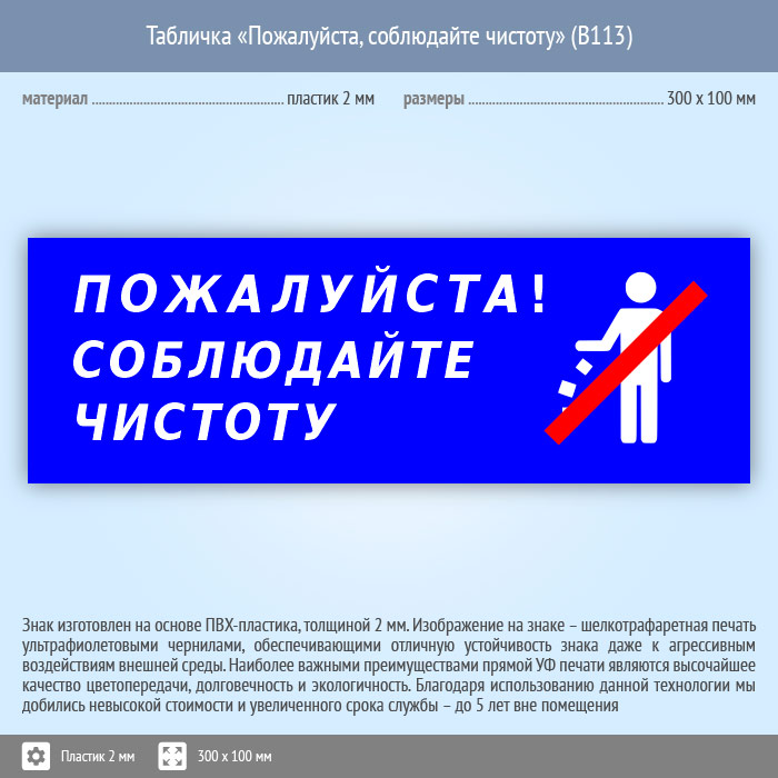 Табличка «Пожалуйста, соблюдайте чистоту», B113 (пластик, 300х100 мм) в Нижнекамске купить