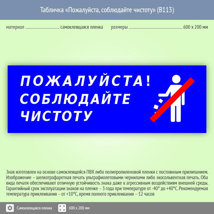 Табличка «Пожалуйста, соблюдайте чистоту», B113 (пленка, 600х200 мм) в Нижнекамске купить