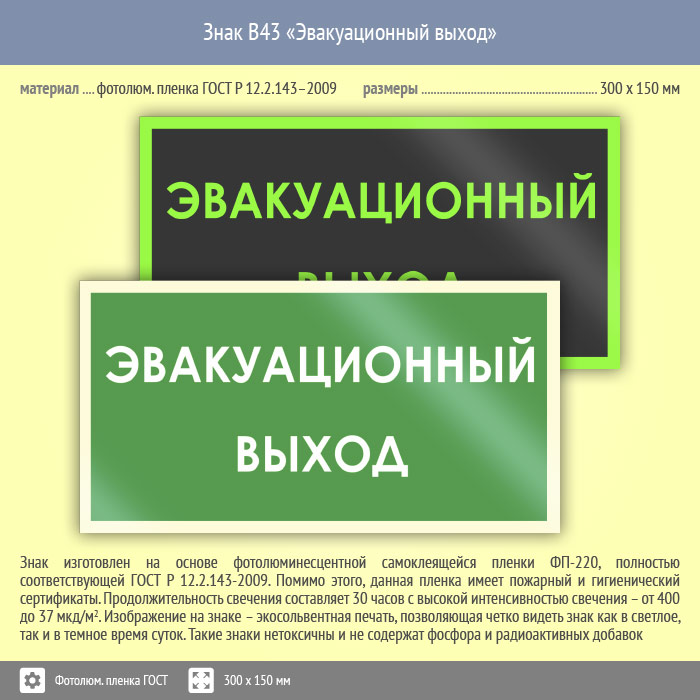 Знак B43 «Эвакуационный выход» (фотолюминесцентная пленка ГОСТ 34428-2018, 300х150 мм) в Нижнекамске купить