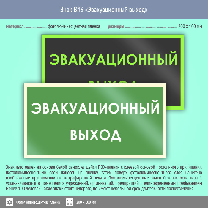 Знак B43 «Эвакуационный выход» (фотолюминесцентная пленка ГОСТ 34428-2018, 200х100 мм) в Нижнекамске купить