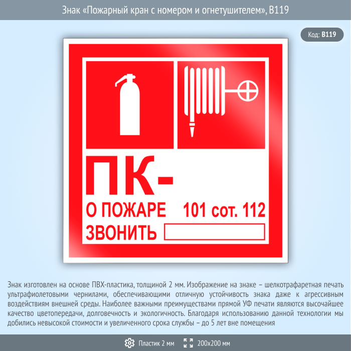 Знак «Пожарный кран с номером и огнетушителем», B119 (пластик, 200х200 мм) в Нижнекамске купить