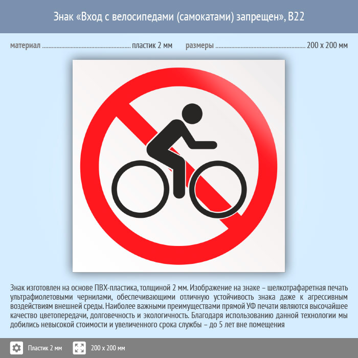 Знак «Вход с велосипедами (самокатами) запрещен», B22 (пластик, 200х200 мм) в Нижнекамске купить